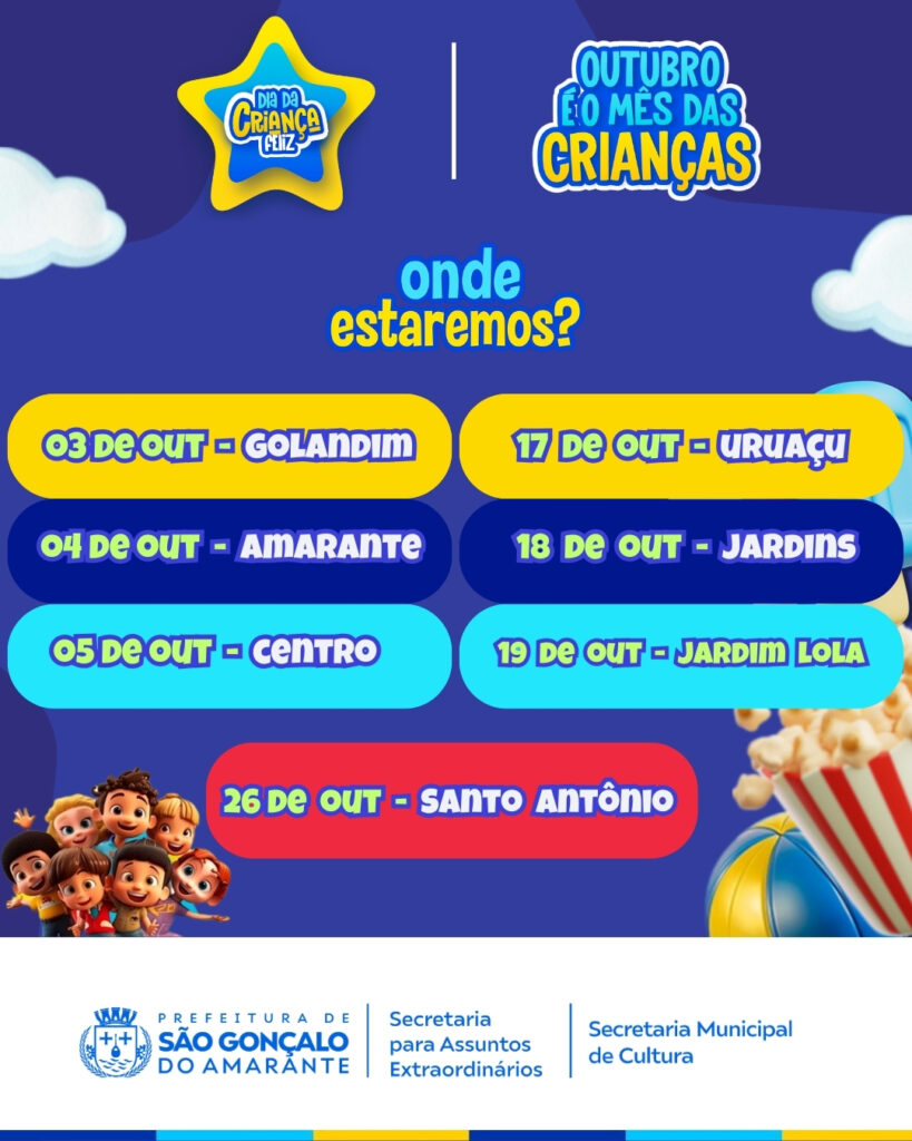 A Prefeitura de São Gonçalo do Amarante, por meio da Secretaria Municipal para Assuntos Extraordinários, a Secretaria Municipal de Cultura, e apoio das demais secretarias, preparou uma grande programação especial para comemorar o Mês da Criança.